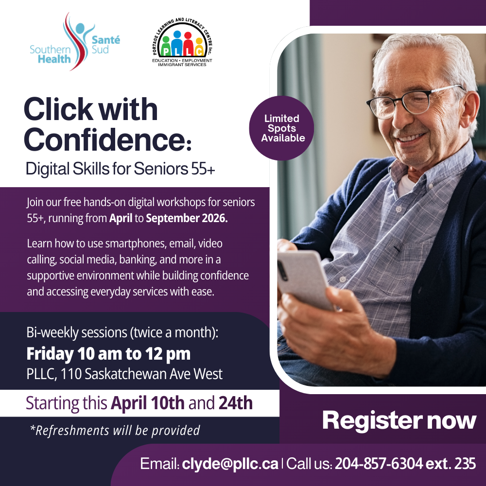 | Conversational French Class 6:30 pm Conversational French Class @ Portage Learning and Literacy Centre Apr 7 @ 6:30 pm – 7:30 pm ![]() 🗣️ Conversational French Class at PLLC Have you always wanted to practise speaking French but didn’t know where to start? This is your sign 💬✨ PLLC is offering a FREE Conversational French Class open[...] | Click with Confidence: Digital Skills for Seniors 55+ 10:00 am Click with Confidence: Digital Skills for Seniors 55+ @ Portage Learning and Literacy Centre Apr 10 @ 10:00 am – 12:00 pm ![]() 💻✨ Click with Confidence: Digital Skills for Seniors 55+ Ready to feel more comfortable using technology in your everyday life? Join our free, hands-on digital workshops designed especially for seniors aged 55+! From learning the[...] | |||||